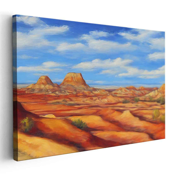 The artist's skillful use of color is evident in the rich, warm reds and oranges dominating the landscape, harmoniously contrasted by the cool blues and whites of the expansive sky above. This vibrant palette breathes life into the desert scenery, infusing the piece with a dynamic energy that captivates the viewer.