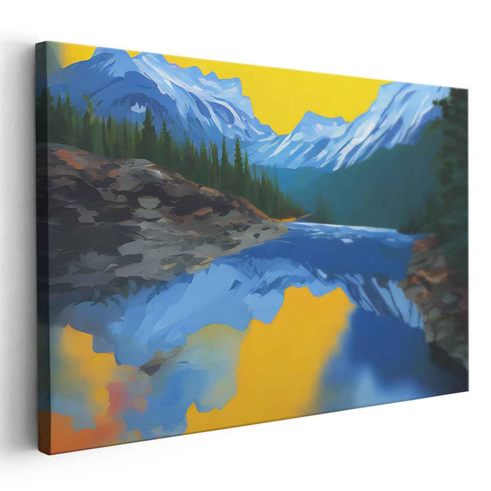 The artwork's primary color, a striking yellow representing the sky, gracefully transitions into a deep blue as it kisses the tranquil lake's surface. Secondary hues include an array of greens from lush forests, earthy browns of rocky terrain, and the pristine whites of snowy mountain peaks. These colors harmonize to depict a picturesque landscape that feels alive and vibrant.