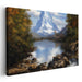 The overall mood of the artwork is peaceful and contemplative, inviting viewers to immerse themselves in the natural beauty of the landscape. Ideal for a living room or study, this piece can serve as a focal point, infusing the space with a sense of calm and inspiration drawn from the serene majesty of the mountains and the reflective lake.