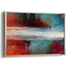The composition is a dance of abstract forms, with rich reds and vibrant oranges dominating the lower half, transitioning gracefully into cool turquoise and teal shades in the upper portion. A central band of white cuts through the piece, offering a serene balance amidst the intense colors, hinting at a river or misty horizon, adding depth and intrigue.