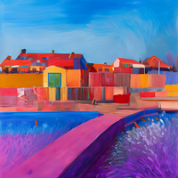 This artwork bursts with primary and secondary colors, with a predominant play of vibrant blues, reds, and yellows that dance across the canvas. The azure blue sky sets a cheerful backdrop, while the houses, painted in a variety of bright hues, radiate warmth and charm, creating a lively and inviting ambiance. The foreground, a mix of purples and pinks, adds depth and mystery with abstract flora or watery reflections, inviting viewers to explore the scene further.