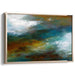 Introducing "Chromatic Symphony Mirage," an enchanting canvas art print that mesmerizes viewers with a captivating interplay of colors and textures, creating a harmonious blend of tranquility and dynamic movement. This masterpiece predominantly features deep, rich hues of teal and turquoise, seamlessly merging with earthy tones of burnt sienna and ochre, complemented by bursts of white and soft blues resembling drifting clouds, infusing the scene with lightness and fluidity.