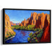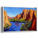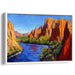 Introducing the "Chromatic Terrain Impressions: Vibrant Landscape Canvas Art Print," a mesmerizing painting that transports viewers to a breathtaking canyon bathed in the warm glow of a setting sun. This captivating artwork showcases rugged cliffs painted in rich hues of orange and red, commanding attention against the backdrop of a tranquil blue river meandering through the valley.