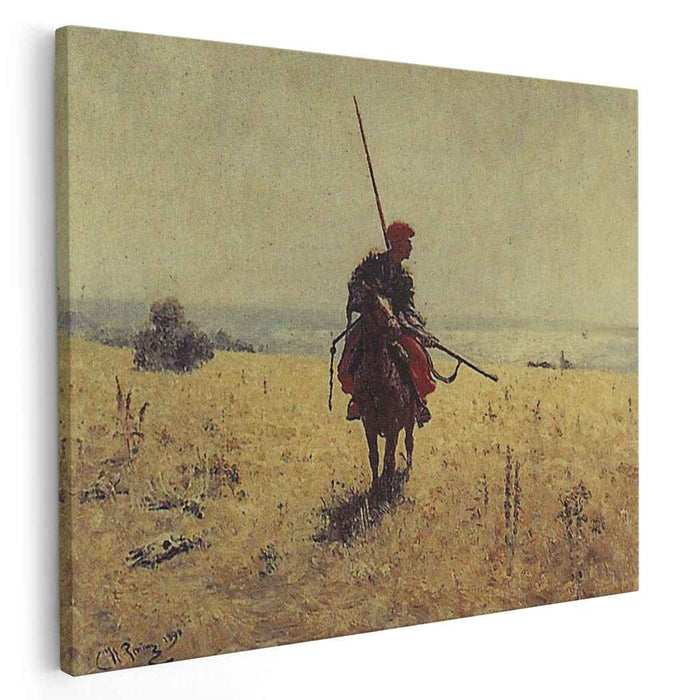 With masterful brushstrokes, Repin captures the Cossack's watchful gaze and rugged features. The vibrant palette, dominated by rich greens and browns, reflects the vastness and beauty of the steppe. The dynamic composition, with the Cossack's horse rearing in the foreground and the boundless horizon stretching behind, creates a sense of movement and urgency.