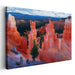 Introducing 'Crimson Canyon Melodies,' a captivating canvas art print that transports viewers to a rugged landscape reminiscent of the iconic Bryce Canyon. This breathtaking artwork showcases towering rock formations, called hoodoos, rising dramatically in vibrant shades of orange and red against a serene backdrop of rolling hills and a soft morning sky.