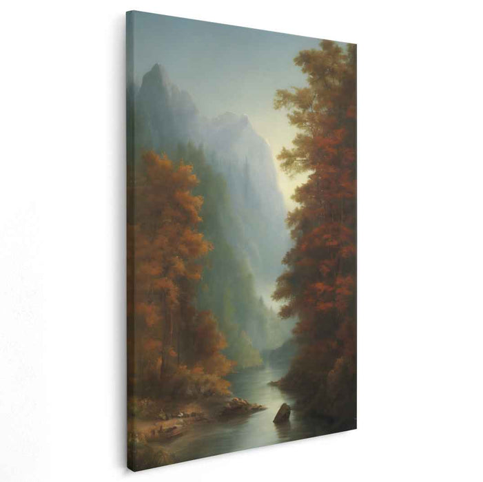 The foreground is adorned with trees showcasing warm, earthy tones of rust and ochre, their leaves a vibrant display of autumnal glory. In the distance, misty blues and greens dominate the mountains and a gentle river meanders through the landscape, adding a cool contrast to the warm tones of the forest. The delicate balance of colors creates a harmonious and inviting atmosphere, drawing the viewer deeper into the artwork's serene embrace.