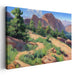 Step into the breathtaking world of 'Earthly Splendor,' a mesmerizing canvas art print that encapsulates the grandeur and tranquility of a rugged landscape. This artwork presents a vivid depiction of a canyon, where majestic rock formations soar against a backdrop of a clear blue sky.