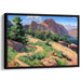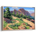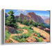 The foreground of the painting features a meticulously crafted trail, beckoning the observer to meander through a sun-kissed path bordered by lush greenery and sporadic wild shrubs. The artist skillfully utilizes a rich palette dominated by earthy browns and oranges, harmonized by the verdant greens of the foliage and the deep blues of the sky. Subtle hints of white in the clouds, along with darker greens and blues, add dimension and contrast to the vegetation and shadows, creating a visual symphony of nature's hues.