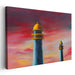 Introducing 'Echoes Of Golden Waves,' a mesmerizing canvas art print that showcases the striking beauty of two majestic lighthouses set against a vibrant, painted sky that appears to be on fire with a rich spectrum of colors. The sky transitions seamlessly from fiery reds to deep oranges, delicately blended with soft yellows and hints of serene blues, creating a breathtaking backdrop for the towering lighthouses.
