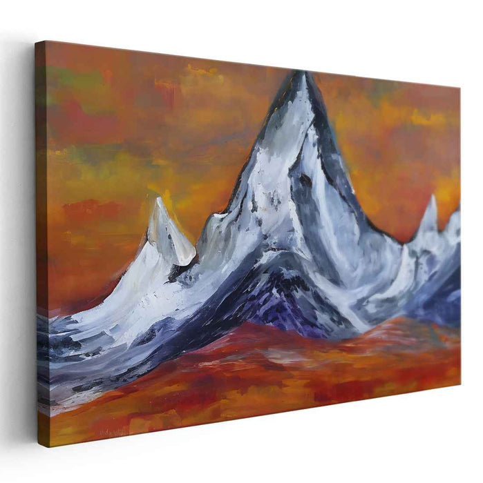 Introducing 'Echoes of Misty Peaks: A Vivid Mountain Landscape,' a captivating canvas art that transports viewers into a realm of majestic mountains standing tall against a sky ablaze with fiery hues. This stunning artwork showcases a central, snow-capped peak surrounded by smaller peaks, all depicted in a mesmerizing blend of white and blue tones.
