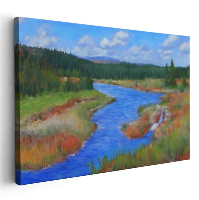 Introducing "Echos Of Solitude: Serene Wilderness Landscape Canvas Art Print," a mesmerizing artwork that beckons viewers into a tranquil riverside setting, capturing the essence of peaceful wilderness and natural beauty. This captivating painting portrays a meandering river gracefully flowing through a lush, green landscape, inviting onlookers to immerse themselves in its serenity.