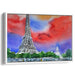 The artist's vibrant palette showcases primary colors of red and blue, complemented by secondary hues of green and purple, creating a striking contrast that brings the scene to life. The sky transitions seamlessly from fiery red to calming blue, forming a dramatic canvas for the Parisian landmark to shine.