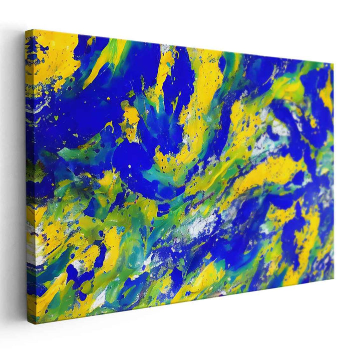 Dive into the vibrant whirlpool of 'Electric Currents,' a stunning canvas print that encapsulates the dynamic energy and movement of abstract expressionism. This artwork features an electrifying blend of deep blues and vivid yellows, swirling together with splashes of green and white, creating a visual spectacle that is both chaotic and harmoniously balanced. The primary blue tones suggest depth and mystery, while the bright yellow streaks inject a sense of excitement and spontaneity. Green accents provide a refreshing touch, grounding the otherwise ethereal composition. The use of bold, fluid brushstrokes and the splattering technique gives the painting a raw, unfiltered appeal, reminiscent of the works of Jackson Pollock.