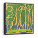 The tree-like figures, intertwined with playful hints of bright blue and yellow, create a dynamic contrast that elevates the forest's whimsical and ethereal allure. Bold, sweeping lines and varied brushstroke techniques infuse the piece with textural depth, offering viewers a visually stimulating experience.