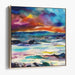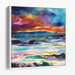 The upper portion of the canvas is a spectacle of vibrant hues, with the sky painted in a mesmerizing palette of fiery reds, deep blues, and bursts of orange, reminiscent of a celestial sunset painting the firmament. Below, the scene transitions into serene waters and lush landscapes, with horizontal strokes of rich greens, soft yellows, and icy blues that mimic reflective waters, creating a tranquil visual symphony.