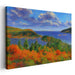 Immerse yourself in the vibrant beauty of 'Enchanted Eden Glimpse: Lush Landscape Canvas Art Print', a breathtaking artwork that captures the essence of a picturesque landscape during the fall season. This stunning piece features a panoramic view of a serene lake nestled among rolling hills, with the foliage transforming into a riot of warm autumn colors. The foreground is dominated by lush orange and red trees, their colors popping against the deep greens of the surrounding forest. The middle ground shows a calm lake reflecting the clear blue sky, scattered with small boats that add a hint of human presence and activity. The background extends into distant hills, partially obscured by the mist, enhancing the depth and vastness of the scene. The artist employs a bold, impressionistic style, using thick, textured brushstrokes that add a dynamic and almost tactile quality to the trees and water, giving the scene a lively, energetic feel. This artwork is reminiscent of the styles of famous landscape painters like Claude Monet and Albert Bierstadt, known for their ability to capture the light and mood of natural settings. 'Enchanted Eden Glimpse' would be a perfect addition to any space that desires a touch of nature's tranquility and the warmth of autumn colors, particularly suited for living rooms, studies, or spaces where relaxation and inspiration are cherished.