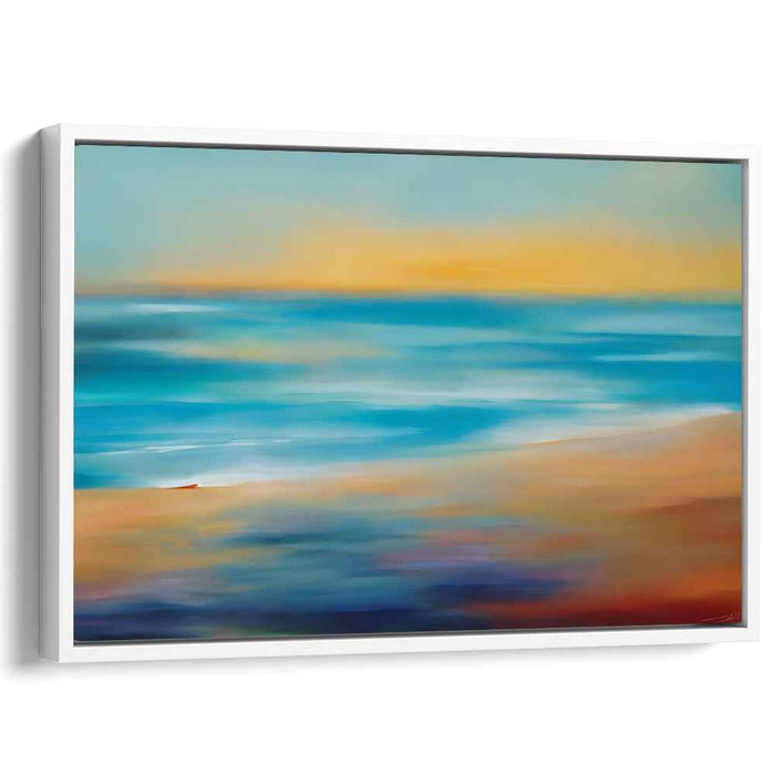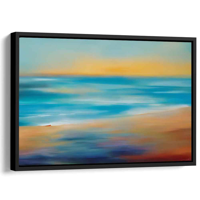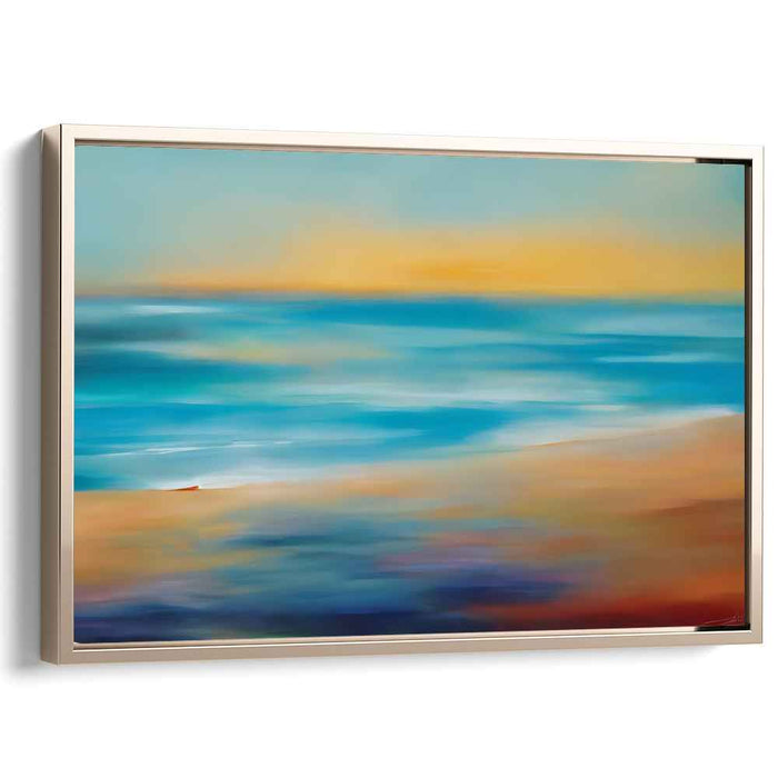 The soft, blurred lines and fluid colors in this painting beautifully capture the rhythmic motion of the waves and the expansive sky. The dominant blue symbolizes depth and stability, while the harmonious interplay of secondary colors like orange, yellow, and hints of white infuse the canvas with a luminous warmth, illuminating any space it graces.