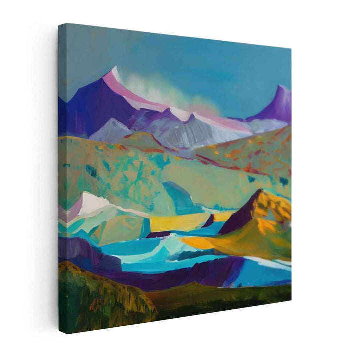 Introducing "Ephemeral Peak Reverie: Abstract Mountain Landscape Canvas Art Print," a mesmerizing masterpiece that transports viewers to a serene and enchanting mountainous region, capturing the majestic beauty of snow-dusted peaks illuminated by the soft light of dawn or dusk. This contemporary abstract landscape painting is a symphony of vibrant blues and purples, complemented by hues of yellow, green, and orange that infuse warmth and depth into the composition.