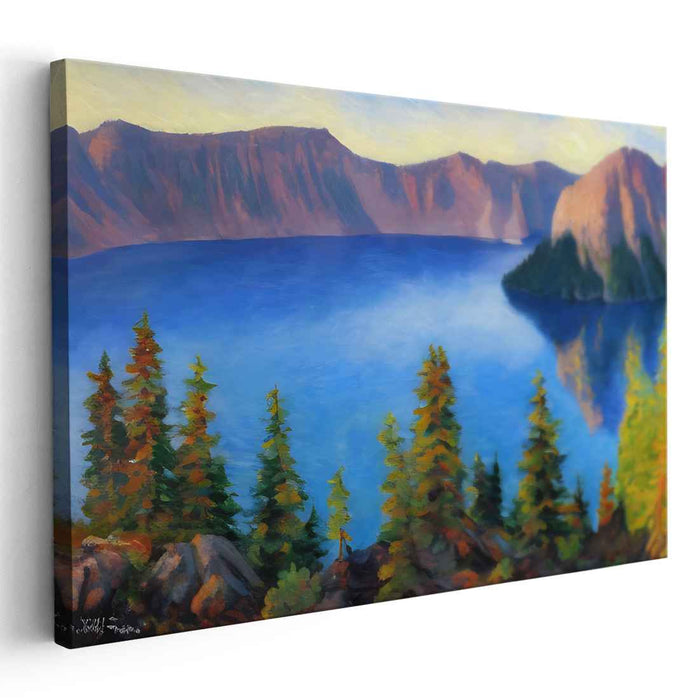 Step into the mesmerizing world of 'Eternal Reflections Peak: Majestic Lake and Mountain Landscape Canvas Art,' a captivating piece that transports you to a serene lake embraced by majestic cliffs and lush greenery. This artwork beckons with a scene so vivid, it feels almost surreal—a deep blue lake mirroring the fiery foliage and the rugged, shadowy cliffs that stand guard.