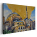 The painting portrays the Hagia Sophia against a backdrop of a dramatic golden-yellow sky, imbuing the scene with a mystical ambiance that hints at either the break of dawn or the onset of dusk. The monumental dome and towering minarets of the mosque take center stage, rendered in a rich palette of ochres, deep blues, and subtle greens. These hues not only accentuate the intricate architectural features but also infuse the composition with a welcoming and warm atmosphere.