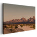 Introducing 'Ethereal Sandstone Peaks Dance,' a mesmerizing canvas art print that transports viewers to the serene beauty of a majestic desert landscape at dusk. This captivating artwork captures the essence of a tranquil and expansive desert scene, dominated by a range of mountains bathed in the warm, golden light of the setting sun.