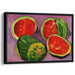 The artist's bold and expressive brush strokes infuse the piece with a dynamic texture, highlighting the intricate natural patterns and vivid colors of the watermelons. The dominant fiery red hue of the fruit pops against the deep greens and soft purples of the background, creating a visually stimulating and delectable effect that exudes freshness and vitality.