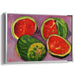 Step into the tantalizing world of 'Fauvist Chromatic Symphony,' a mesmerizing canvas art print that encapsulates the essence of summer's ripe bounty within your living space. This captivating artwork showcases a detailed, close-up perspective of four sliced watermelons, where two halves reveal the luscious, crimson flesh adorned with contrasting black seeds, while the other two unveil the intriguing, vibrant green rinds.