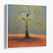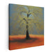 Introducing 'Flame Dance of Nature,' a mesmerizing canvas art print that captures the serene beauty of a majestic tree set against a fiery horizon, enveloped in a dreamlike and contemplative ambiance. The artwork features a solitary tree, elegantly standing amidst a rich, golden-yellow foliage that contrasts vividly with the soft, muted blue sky above. The ground below extends in a fiery expanse of orange, seamlessly blending into the distant horizon, creating an almost surreal vista.