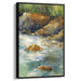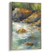 Sunlight filters through the foliage, creating a dance of dappled shadows and gleaming highlights on the river's surface, imbuing the scene with a sense of depth and motion. The rocks, depicted in rich earth tones of brown and ochre, break the water's surface, providing both tactile texture and visual contrast to the fluidity of the river.