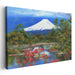 Introducing 'Frosty Mountain Serenity,' a mesmerizing canvas art piece that encapsulates the serene grandeur of a majestic mountain landscape, reminiscent of the iconic Mount Fuji, set in a tranquil and harmonious ambiance. This captivating artwork beautifully captures a peaceful scene where a crystal-clear, reflective lake commands attention, encircled by verdant foliage and vibrant red leaves hinting at the autumn season. The snow-clad mountain towers majestically in the backdrop, its sharp contours contrasting elegantly with the organic forms of the trees and the gentle ripples of the water.