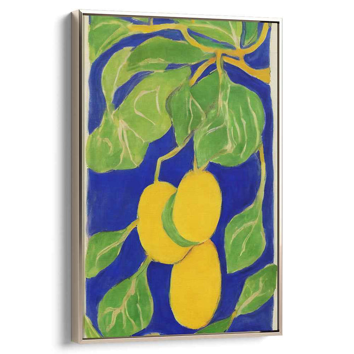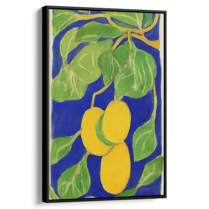 Introducing "Fruitful Flora Symphony," a captivating canvas art print that exudes vibrancy and freshness, featuring a trio of bright yellow lemons suspended from lush green branches set against a deep, royal blue backdrop. This striking artwork captures the essence of simplicity and vitality in its bold depiction of plump lemons and flowing leaves.