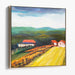Introducing 'Gilded Countryside Haven: Vibrant Farmhouses Amid Golden Fields,' a mesmerizing canvas art print that transports viewers to a tranquil countryside landscape, where rolling hills extend into the distance under a sky that shifts from a moody gray to a vibrant blue, creating a captivating contrast.