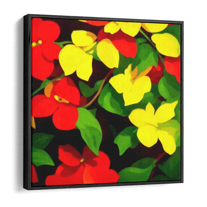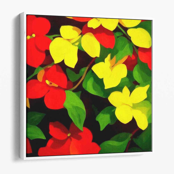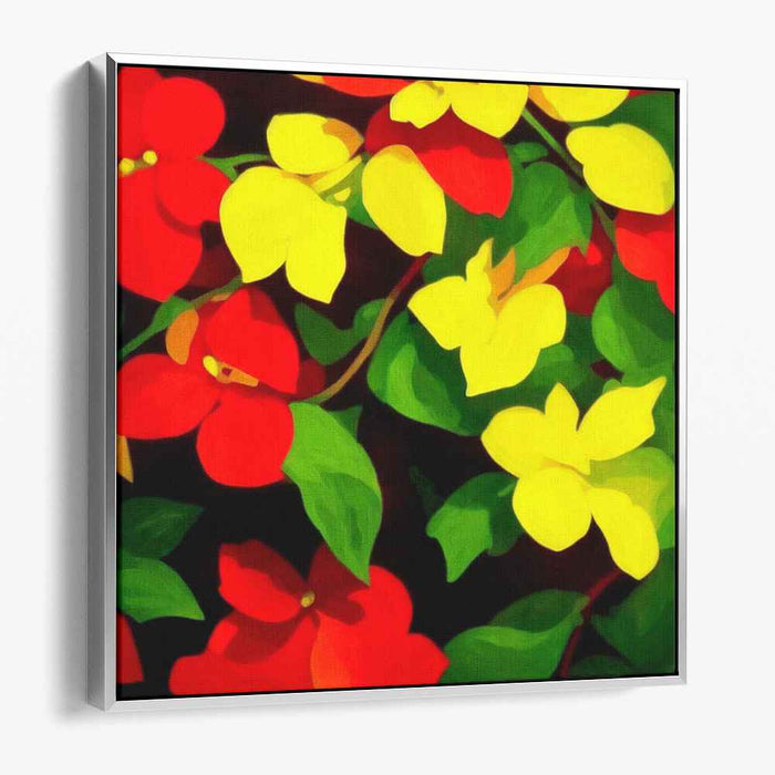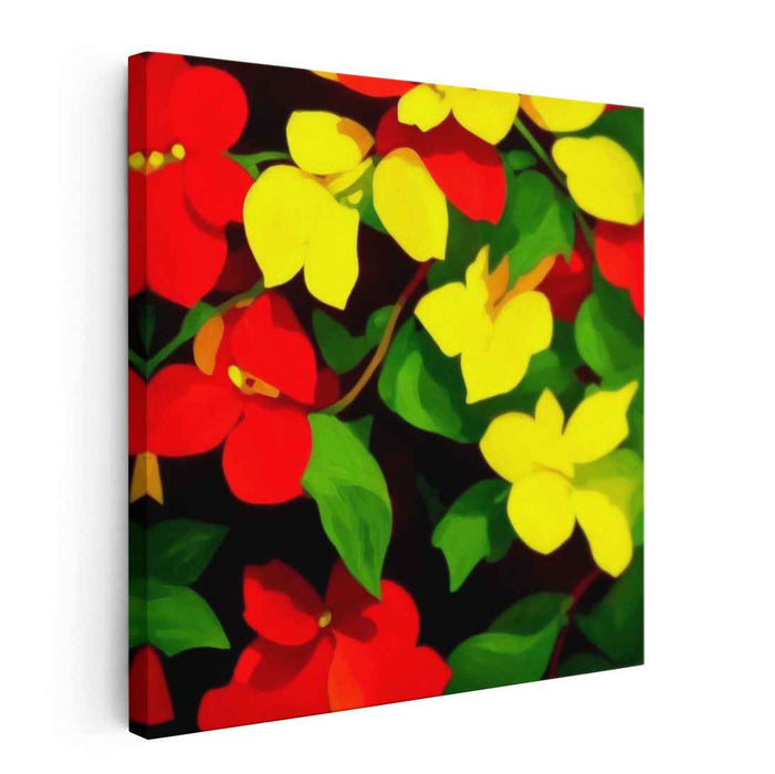 Introducing 'Golden Flames Dance in Canvas: Vibrant Blooms in Yellow and Red,' a mesmerizing canvas art print that brings nature's vivacity into your space, showcasing a jubilant celebration of blooming flowers in a riot of colors that mesmerizes the eye. This artwork bursts with life, featuring a captivating mix of bright yellow and red flowers dancing amidst lush green leaves, creating a visually stunning contrast that captivates the viewer's gaze.