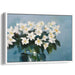 The primary color palette of this artwork features a serene, calming blue background that sets a tranquil atmosphere, enhancing the purity of the white blossoms. Complemented by various shades of green in the leaves and subtle hints of yellow in the flower centers, these secondary colors add warmth and natural vibrancy to the piece, creating a balanced and harmonious composition.