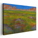 Introducing "Horizon Vistas," a mesmerizing landscape canvas art that beckons viewers into a serene and boundless natural expanse, capturing a sweeping field of verdant greenery that extends to meet the rugged, distant mountains under a vibrant azure sky. This captivating artwork immerses you in a scene where patches of wildflowers and rocks adorn the foreground, painted in a rich palette of warm oranges, reds, and yellows, harmoniously juxtaposed against the lush greens of the meadow. The earthy tones of red and brown in the distant mountains provide a dramatic backdrop, infusing the composition with depth and perspective.