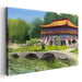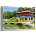 Introducing 'Ink Horizon View,' a mesmerizing watercolor art print that encapsulates the tranquil allure of traditional East Asian architecture harmoniously set amidst a vibrant, lush landscape. The focal point of this exquisite piece is a majestic temple-like structure, distinguished by its grand, upward-curving roof embellished in a luxurious golden sheen, showcasing the opulent beauty of classical East Asian design.