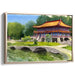 The artwork intricately portrays the temple's elaborate features, highlighted with accents of red and gold, reflecting the meticulous artistry of traditional East Asian architecture. Descending from the edifice, a cascade of white stone steps leads to a serene body of water, gracefully traversed by an elegantly arched stone bridge. The flowing water, depicted in gentle, soft strokes, mirrors the lush greenery of the surrounding foliage, creating a harmonious and serene ambiance.