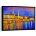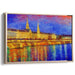 The painting is a symphony of rich colors, with bold primary hues dominating the scene—vivid blues, fiery oranges, and radiant yellows, complemented by secondary tones of red and green. These colors blend harmoniously to evoke a feeling of warmth and nostalgia, inviting viewers to immerse themselves in the enchanting atmosphere of the European cityscape.