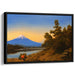 Introducing 'Journey Through Peaks,' a mesmerizing canvas art print that transports viewers to a serene mountain landscape, where a group of travelers in traditional attire stands by a tranquil lake, gazing at a majestic snow-capped mountain under the warm hues of a setting or rising sun. This captivating artwork captures the essence of untouched wilderness and human exploration.
