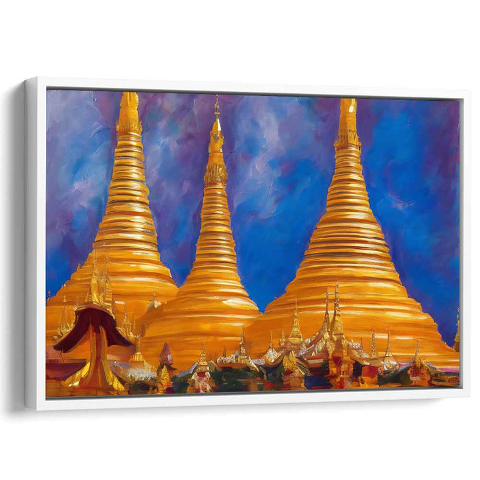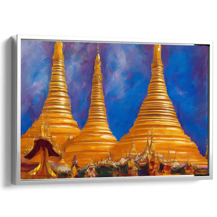 Introducing 'Landmarks of Light: Majestic Monuments Under a Vibrant Sky,' a mesmerizing landscape canvas art that captures the grandeur of towering golden pagodas set against a dynamic, vivid sky. This captivating artwork immerses viewers in a scene where the primary focus is on the majestic pagodas, their surfaces gleaming with a brilliant golden hue under the radiant light.