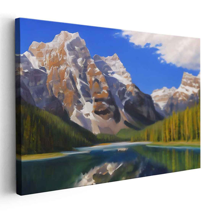 Introducing 'Majestic Mountaintop Reflections,' a captivating landscape canvas art print that transports viewers to a serene alpine paradise, where snow-capped peaks and reflective lakes harmonize under a vibrant blue sky. This breathtaking artwork captures the essence of a majestic mountainous region, possibly inspired by the grandeur of the Rocky Mountains.