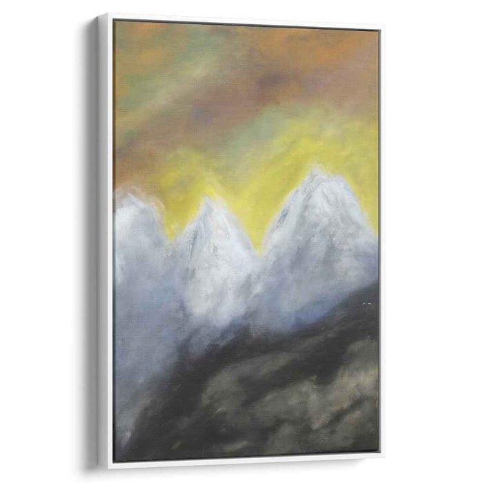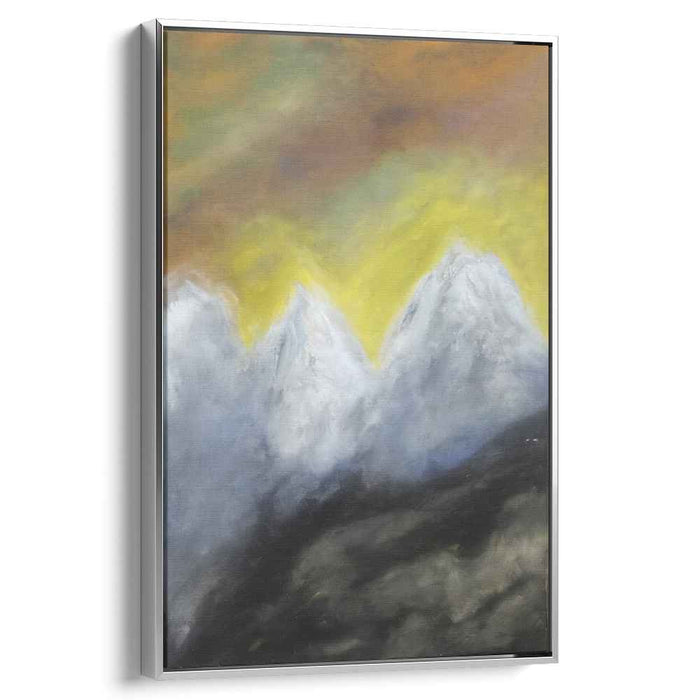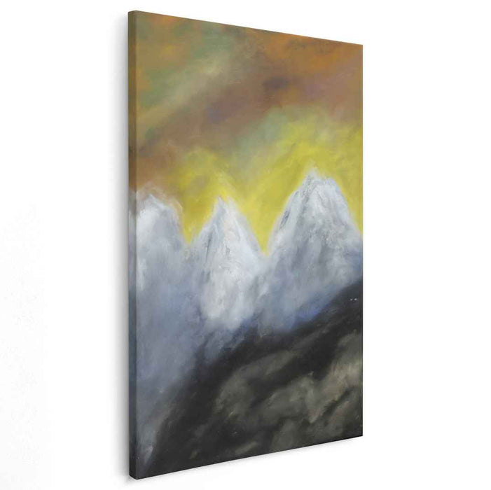 Introducing 'Majesty Peaks: Ethereal Mountain Landscape,' a captivating canvas art that transports viewers into a serene yet dramatic natural setting, showcasing a trio of majestic mountains veiled in mist and bathed in a soft, glowing light. The peaks, rendered in striking shades of white and gray, stand sharply against a backdrop of a sky painted in rich oranges, yellows, and subdued greens, evoking either the early dawn or dusk's last light.