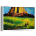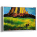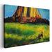 Introducing 'Meadow Majesty Rising High: Towering Rock Formation in Vibrant Meadow,' a captivating piece that mesmerizes viewers with a striking geological wonder at its core. The artwork showcases a majestic rock structure, boldly painted in hues of yellow and orange, exuding grandeur and timelessness.