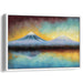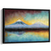 Introducing 'Mirrored Mountain Reflections,' a mesmerizing canvas art print that transports viewers to a serene and awe-inspiring landscape of twin peaks, reminiscent of the majestic Mount Fuji, against a backdrop alive with vibrant hues. This captivating artwork seamlessly blends warm and cool tones to create a visual masterpiece that enchants the eye.