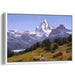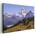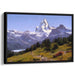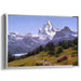 The foreground of the painting unfolds a lush valley adorned with a tapestry of vibrant wildflowers in hues of red, yellow, and purple, infusing the serene landscape with a burst of color. A meandering path guides the viewer through the valley, where tiny figures revel in the idyllic setting, accentuating the mountain's sheer scale and magnificence. The interplay of light and shadow in the artwork brings a sense of depth and realism, illuminating the snow-capped peak to a dazzling gleam while softly caressing the lower slopes and valley.