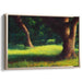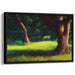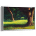 The interplay of light and shadow is a visual symphony, skillfully depicted to create a striking contrast between the sun-kissed grassy foreground and the enigmatic depths of the forest in the background. The rich primary colors of deep greens mirror the abundant foliage, while warm browns and golden hues accentuate the play of sunlight on the tree bark, adding a touch of magic to the scene.