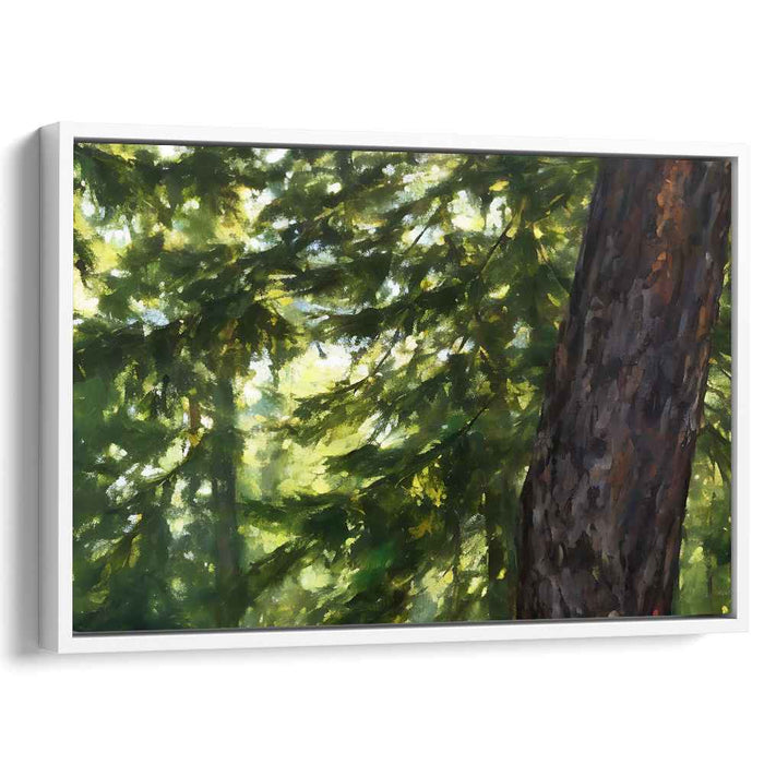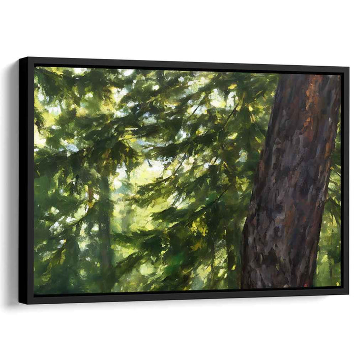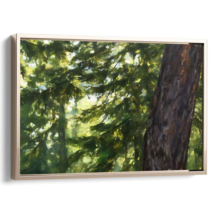 Introducing 'Natural Vista Study,' a mesmerizing nature landscape canvas art print that transports viewers into the tranquil embrace of a forest's verdant canopy. This captivating artwork centers around a majestic tree trunk, meticulously depicted in rich browns and earthy tones, showcasing the intricate textures of its bark and commanding presence.