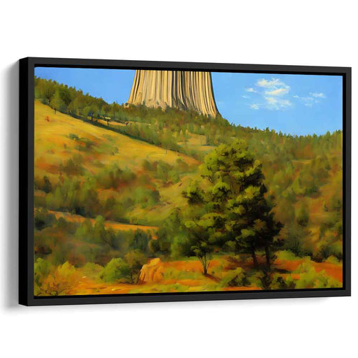 The towering buttes take center stage, their imposing presence contrasted by the lush, verdant forest in the foreground, painted in varied shades of green that add depth and contrast to the overall scene. The artist masterfully blends realism and impressionism, capturing both the serene majesty of the landscape and the dynamic play of light and shadow across the rock formations and the forest below.