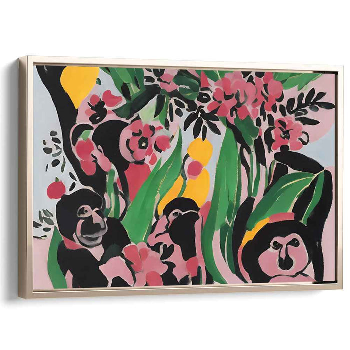 The artist's use of expressive brushstrokes and a vibrant color palette creates a lively mood and dynamic visual experience. By employing abstract representation, the monkeys and tropical foliage come to life, inviting viewers to immerse themselves in this whimsical jungle setting.