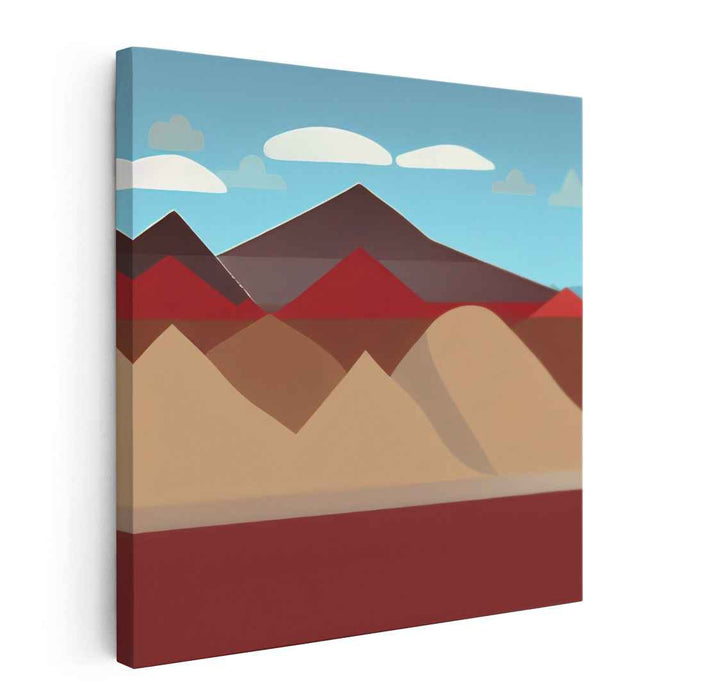Introducing 'Serene Geometric Mountains,' a mesmerizing minimalist landscape canvas art print that transports viewers into a serene mountainous expanse under a clear blue sky. This captivating artwork embraces simplicity, using clean lines and geometric shapes to depict a series of overlapping mountains in a palette of red, brown, and beige, harmoniously juxtaposed against the soft blues of the sky and the purity of white clouds.